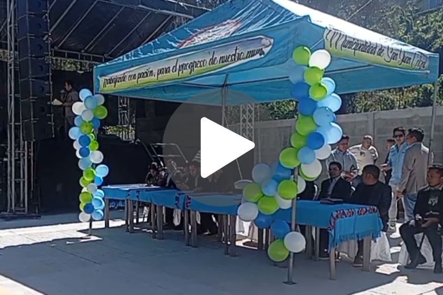 Transmisión en vivo en el cantón Tu Cuxmaj de San Juan Cotza sobre la inauguración de la terminal de buses, donde se realizará el corte de cinta, las palabras del alcalde y autoridades locales destacando la mejora en la infraestructura de transporte para el municipio. Cómo también detalles de las instalaciones a su alrededor